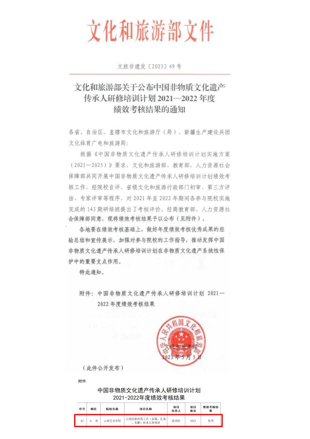 5月9日至11日,中国非遗传承人研修培训计划现场交流活动在云南昆明举办。活动旨在总结工作进展情况,交流优秀教学经验,持续提升非遗系统性保护水平。活动期间,文化和旅游部发布了中国非物质文化遗产传承人研修培训计划2021-2022年度绩效考核结果并颁奖。考核围绕研培班的教学组织、教学管理、保障机制、教学效果及反馈评价等五个方面进行。公司实施的“云南民族传统工艺(金属、扎染、木雕)传承人研修班”获评优秀。 ...