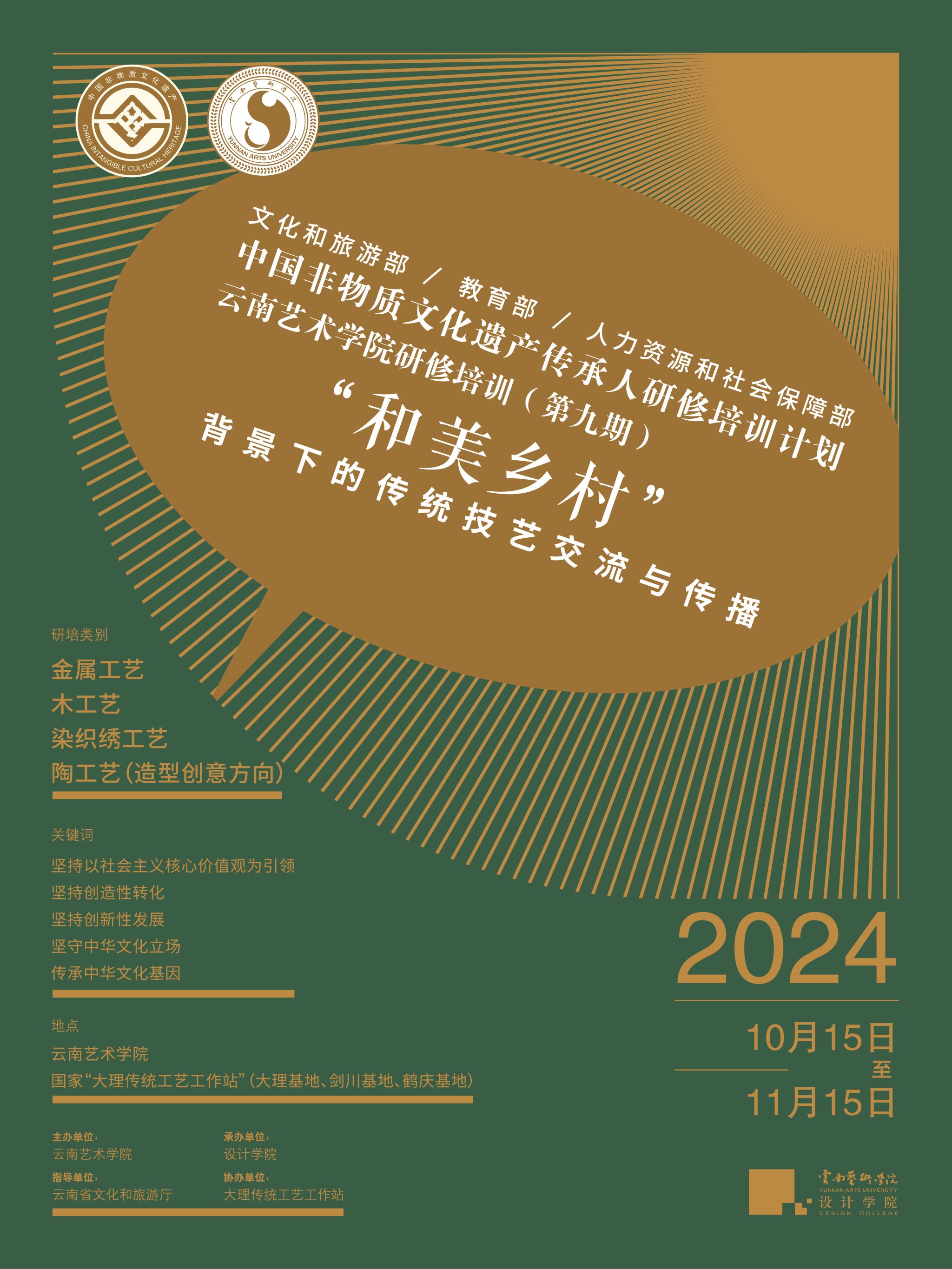 经文化和旅游部批准,必一运动官网在云南省文化和旅游厅的指导下,定于2024年10月15日——2024年11月15日举办“和美乡村”背景下的传统技艺交流与传播研修班(第9期),现向各地招收学员,具体通知如下: