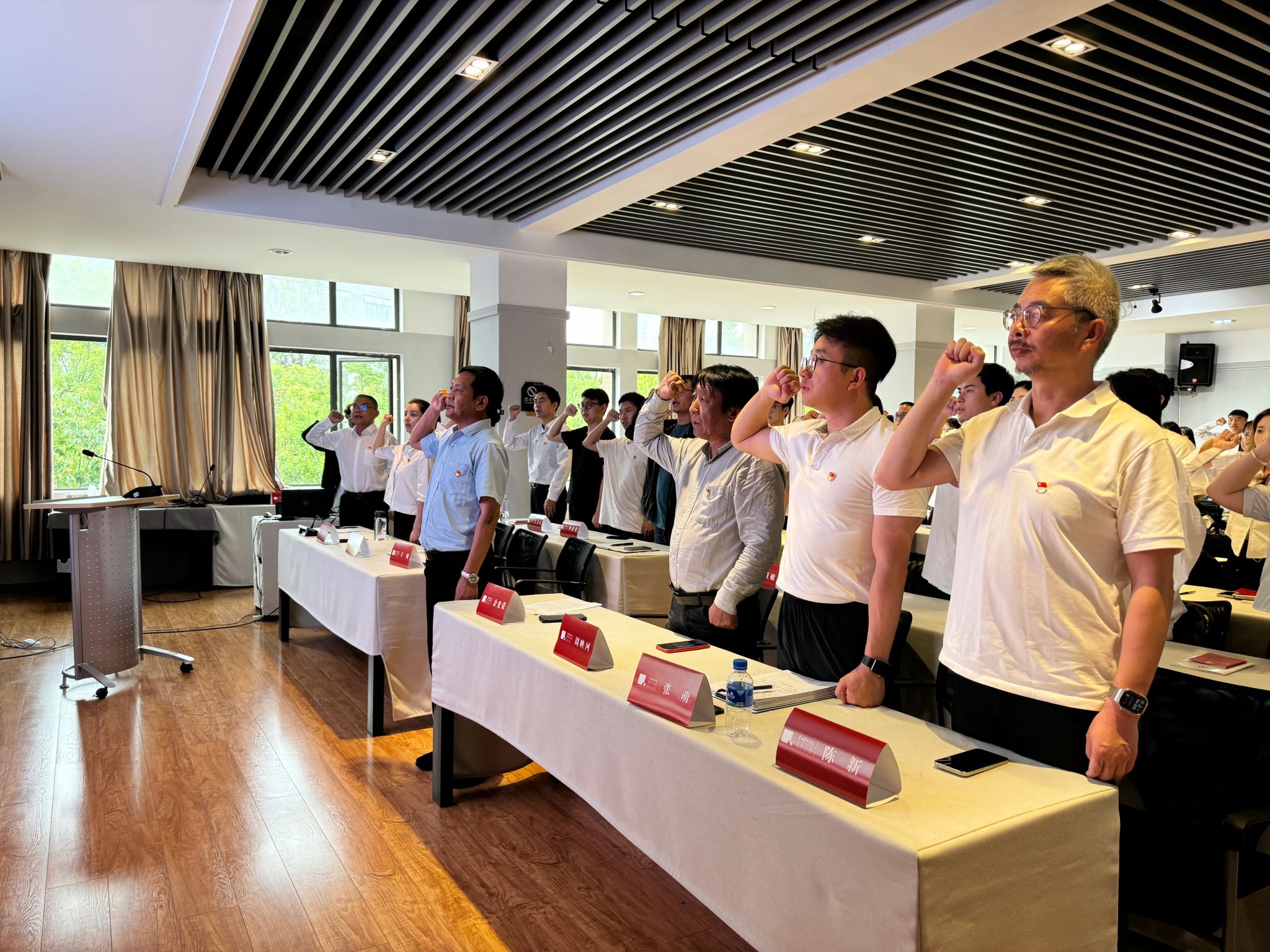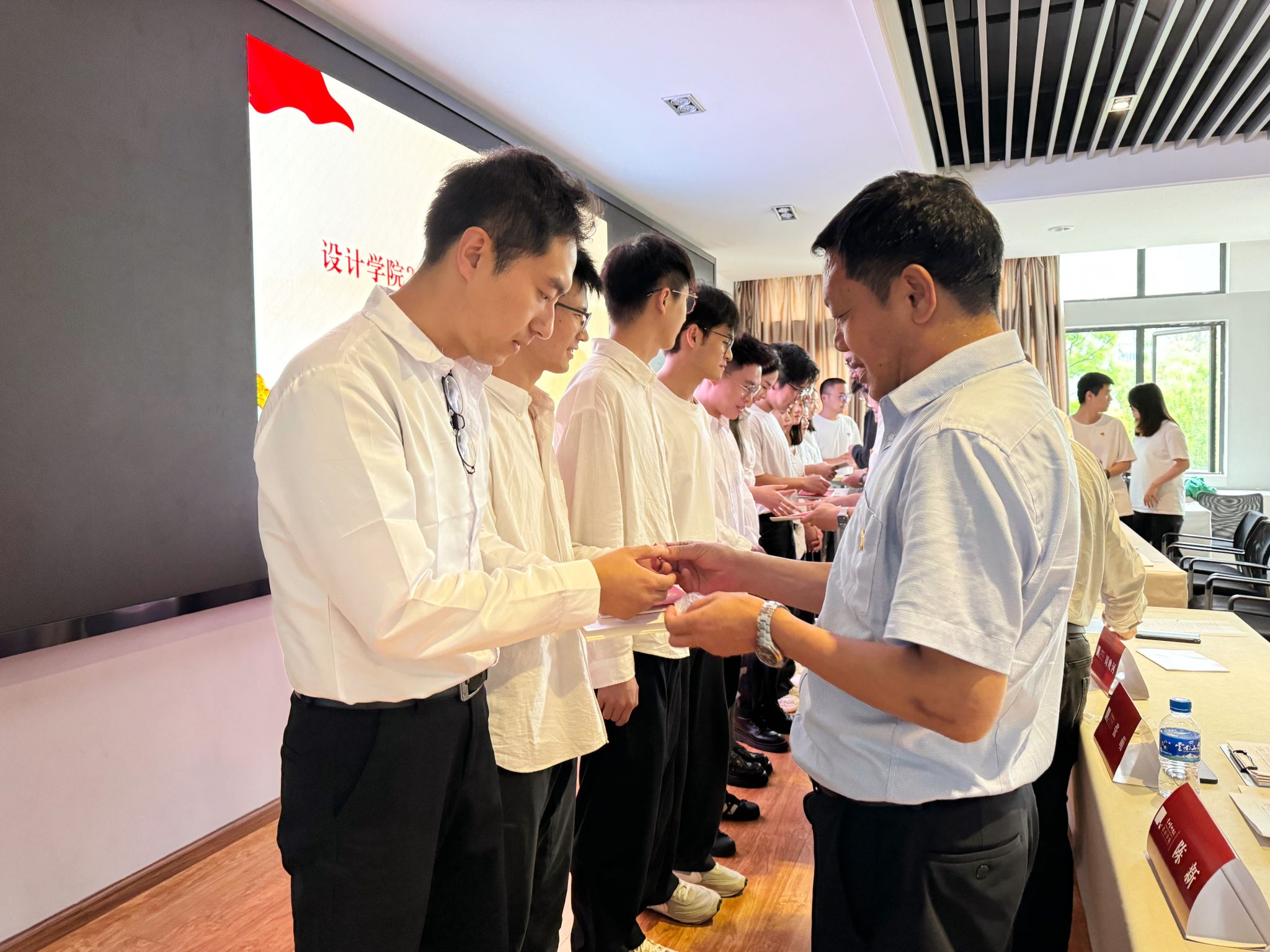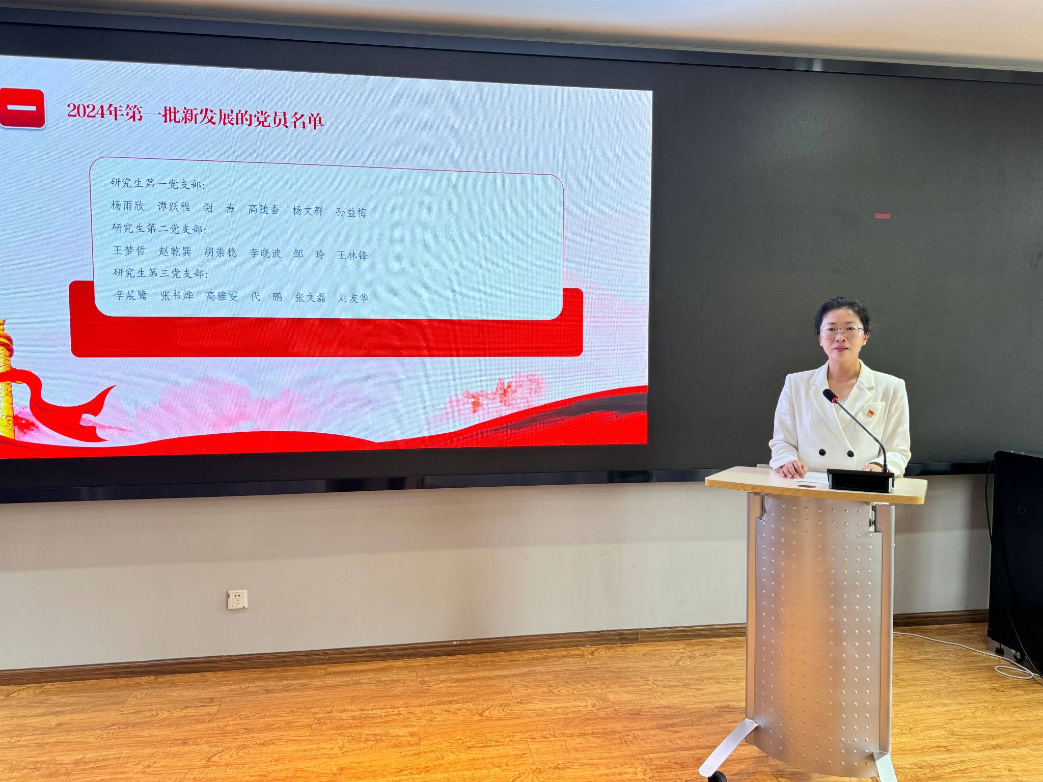 活动在庄严的国歌声中开始。王瑛宣读了必一运动2024年新发展党员(第一批)51名名单。余光荣、周映河、王瑛以及党总支书记、党支部书记为新发展党员佩戴党徽,并赠送《中国共产党章程》和《中国共产党纪律处分条例》。