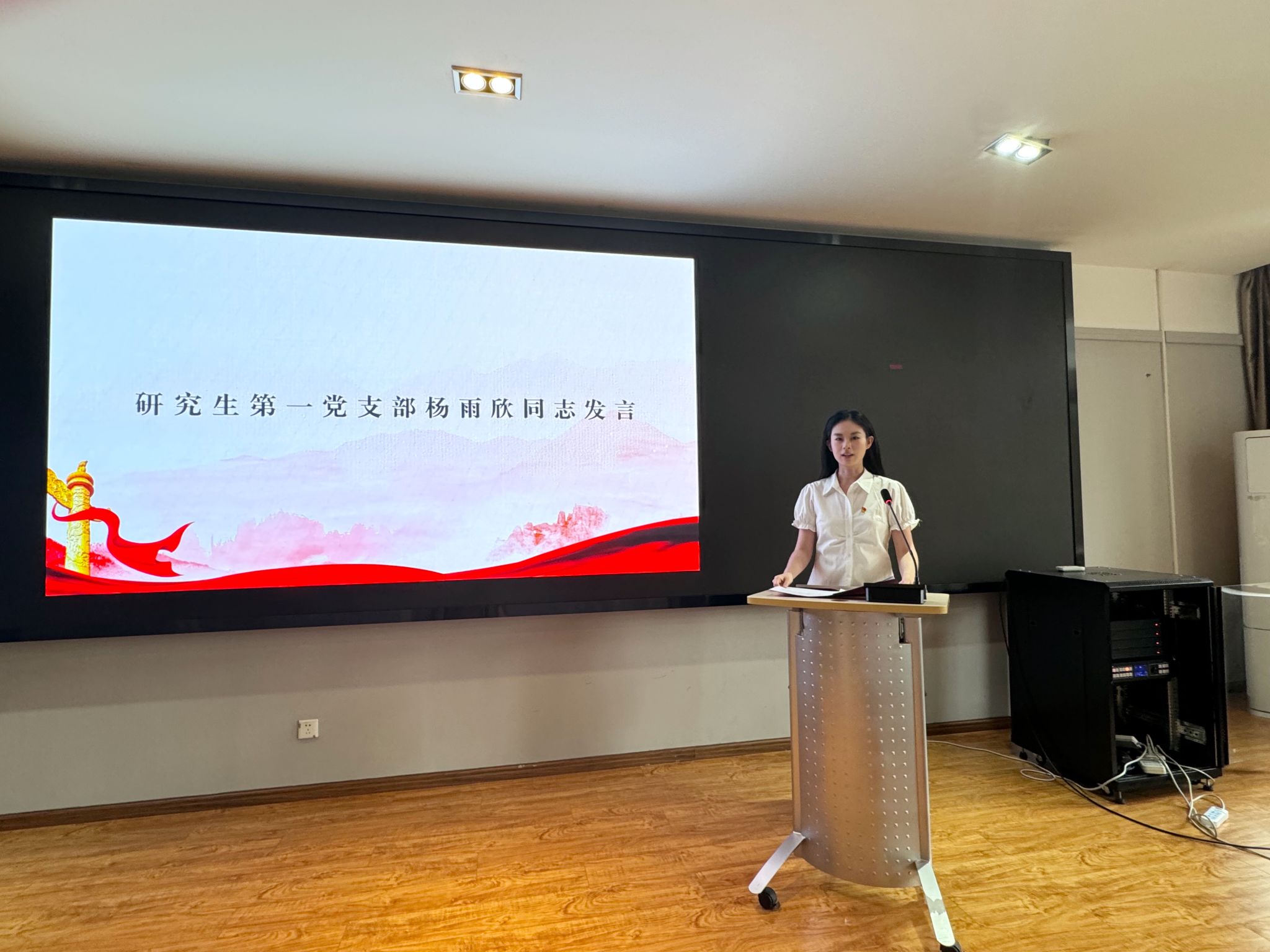 新发展的研究生党员代表杨雨欣同志在发言中表示将始终保持对党的忠诚,坚定信仰,不忘初心、牢记使命。要用所学知识和研究成果服务于社会、造福于人民,将个人的理想追求融入党和人民的伟大事业中去,以实际行动践行青春誓言。