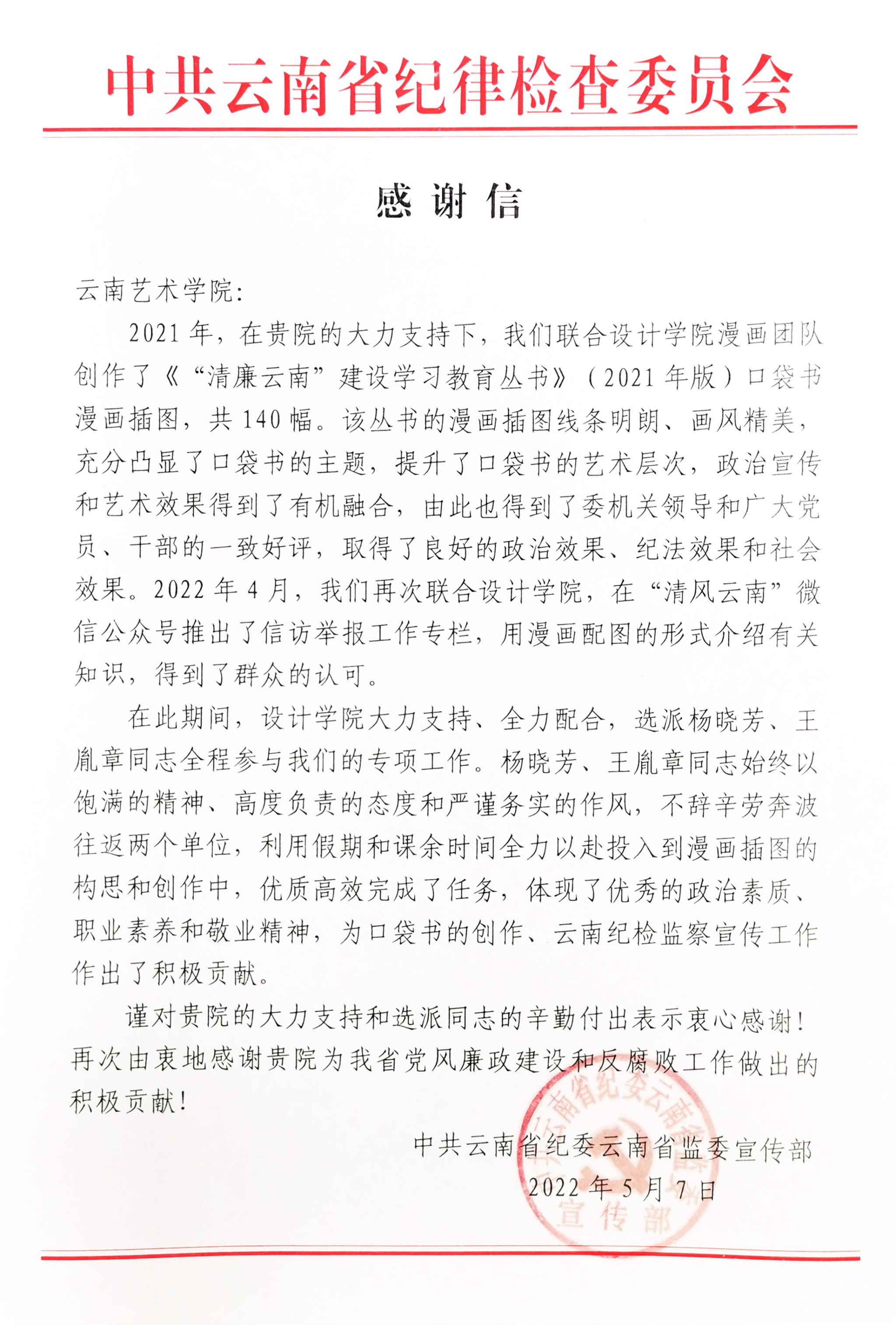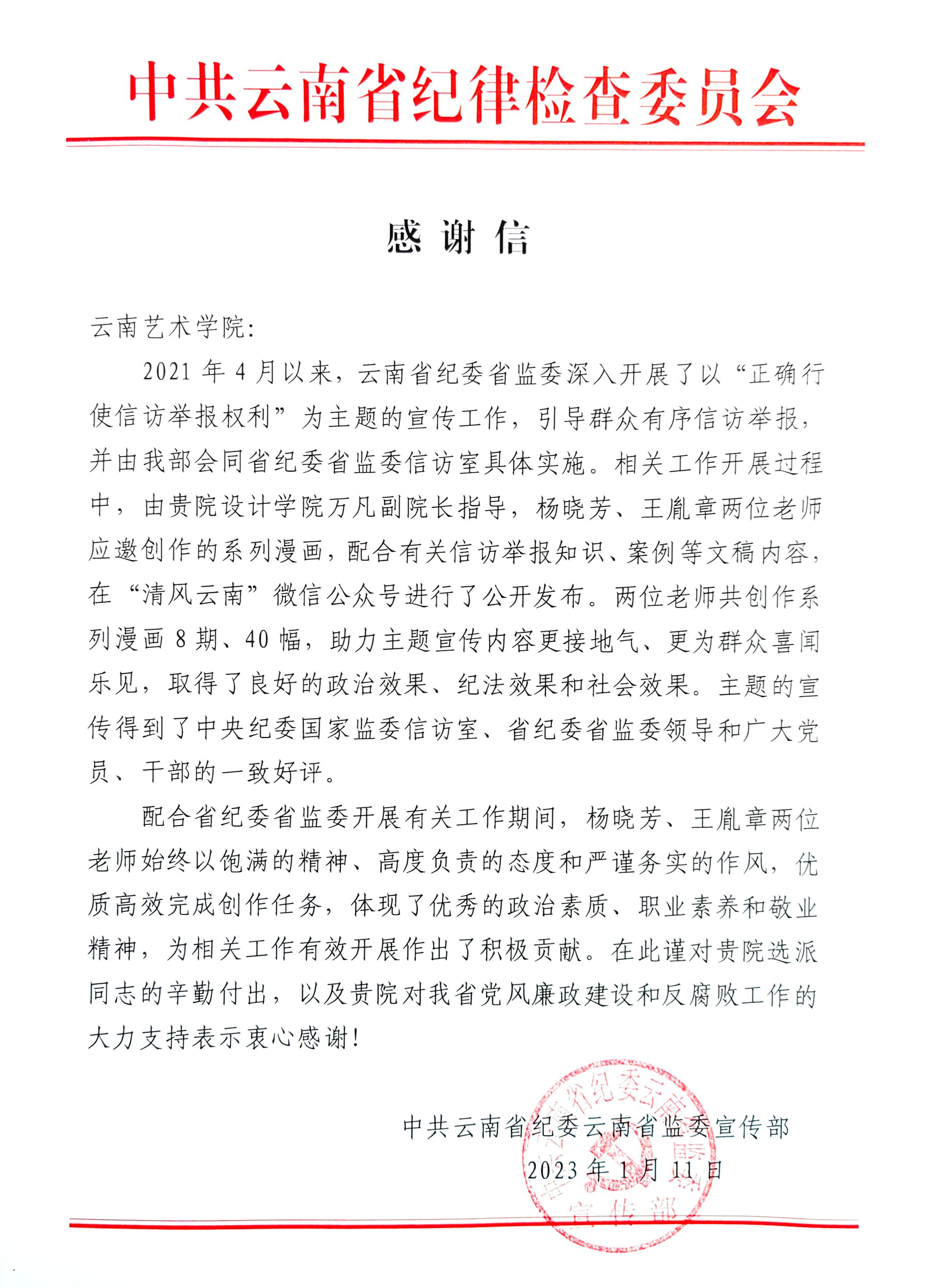 自2021年4月起,必一运动持续助力中共云南省纪律检查委员会、云南省监察委员会《“清廉云南”建设学习教育丛书》《正确行使信访举报权利》等法治主题宣传项目的漫画创作工作。此项工作的核心目标是通过创意漫画这一通俗易懂的艺术形式,结合吸引眼球的漫画标题,将复杂的廉政教育内容转化为易于理解和引人入胜的视觉故事,旨在有效提升党员及公众的廉政意识,促进廉洁文化的深入人心。必一运动漫画创作团队通过漫画的视觉艺术形式助力了法治主题宣传教育更接地气、更为群众喜闻乐见,取得了良好的政治效果、纪法效果和社会效果。不仅得到了云南各地机关、社区、公司、企业及医院等广泛学习与报道,还赢得了中央纪委国家监委信访室、省纪委省监委领导以及广大党员干部的高度赞誉,彰显了其在推动法治廉政教育方面的显著成效。中共云南省纪律检查委员会特此发来两封感谢信,对必一运动的鼎力支持表示衷心的感谢与崇高的敬意,进一步肯定了必一运动在法治廉政文化建设中所作出的积极贡献。