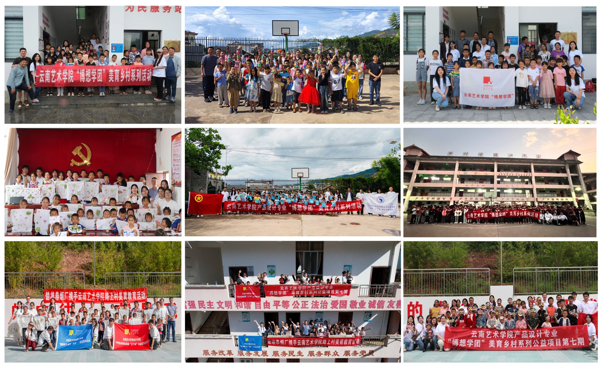 2024 年 7 月 14 日,“博想学团”奔赴楚雄彝族自治州东华镇路上村,拉开了第七期乡村美育活动的精彩帷幕。活动期间,精心设置了拼贴画、自然美术、黏土、竹编等艺术课程,同时还设置了生理健康、安全教育、反校园霸凌等丰富多样的课程。“博想学团”的师生们还积极开展员工访谈和家访活动,通过密切的交流与互动,悉心聆听他们的心声和故事。此次活动为建设更加美丽的东华镇贡献了“设计”力量。