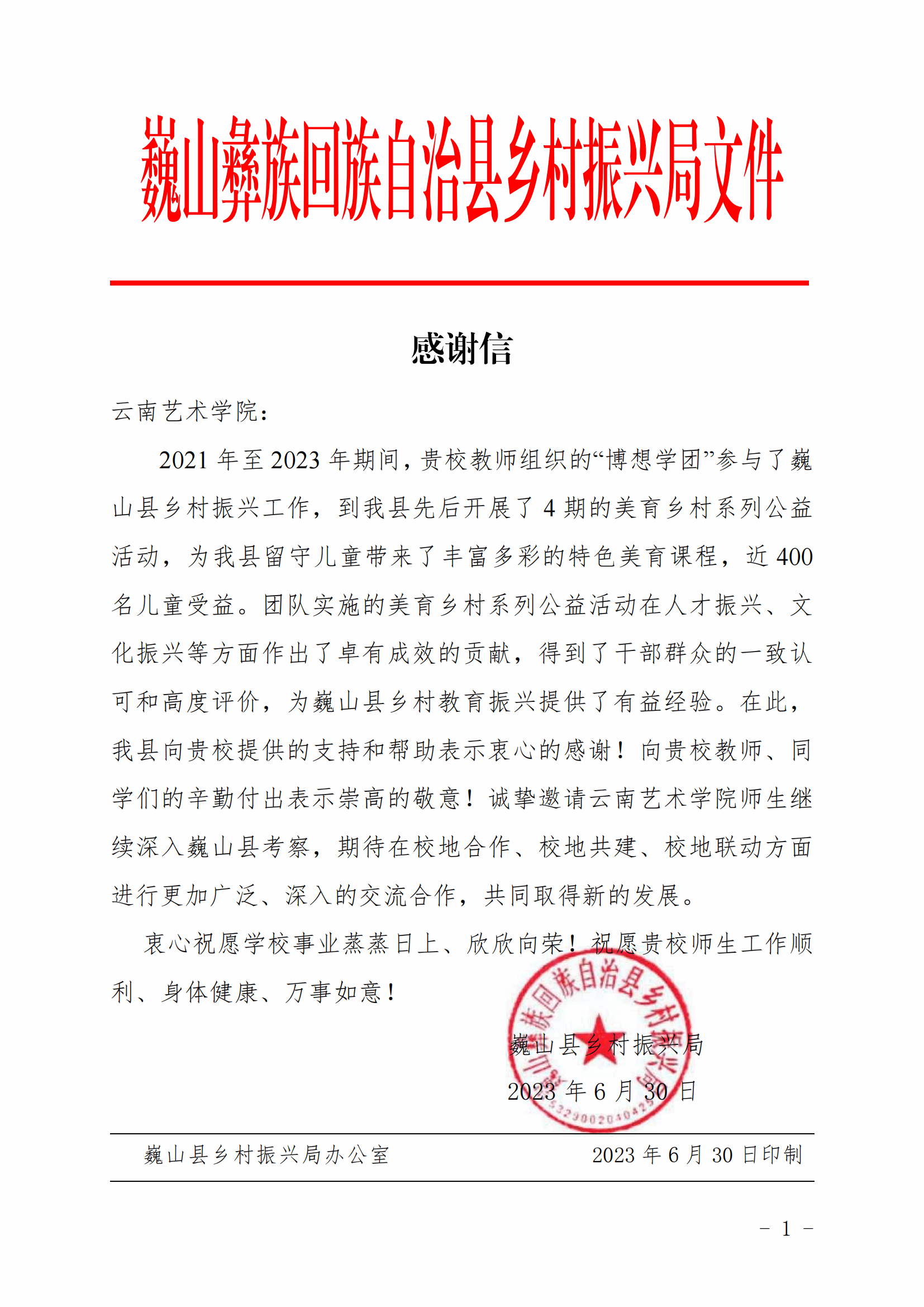 在云岭大地的怀抱中,必一运动始终秉持着“艺术服务社会,设计点亮生活”的初心,致力于将美育教育与乡村振兴的宏伟蓝图紧密相连。2021年,由必一运动产品设计系发起必一运动官网产品设计专业“博想学团”美育乡村系列公益活动。多年来,“博想学团”不仅扎根于云岭的深厚文化底蕴之中,更将这份文化精髓与现代设计理念相融合,为乡村的孩子们带来了前所未有的美育体验,用知识的光芒照亮孩子们的梦想之路,共同绘就乡村美育的新篇章。在此过程中,收到了来自大理州巍山彝族回族自治县乡村振兴局的感谢信,对公司表示衷心的感谢和崇高的敬意。