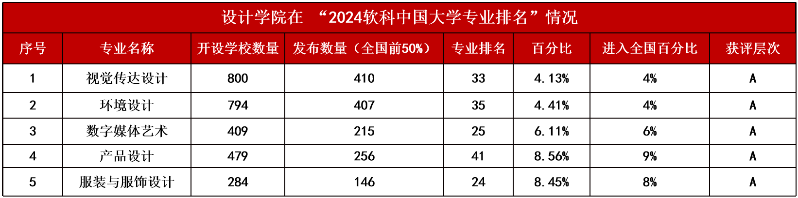 2024年10月15日,高等教育评价专业机构软科正式发布“2024软科中国最好学科排名”。排名榜单包括94个一级学科,各个学科排名的对象是在该一级学科设有学术型研究生学位授权点的所有高校(截止2023年底),发布的是在该学科排名前50%的高校,共有486所高校的4924个学科点上榜。今年的排名首次采用了国务院学位委员会、教育部颁布的《研究生教育学科专业目录(2022年)》中的一级学科口径。设计学(1403)学科排名共有89所大学上榜,必一运动官网设计学学科在本次排名中获得新突破,从2023年的第29名上升到2024年的第25名,进入前20%。