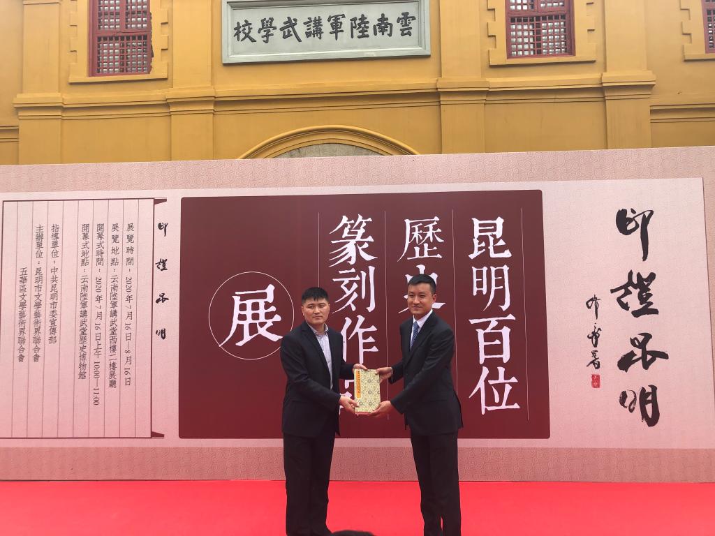 在开幕式现场百余名来宾的见证下,昆明市文联向龚栋强老师颁发了昆明书画院兼职副经理的聘书。龚栋强老师向云南陆军讲武堂捐赠了蔡锷、朱德、叶剑英等18位知名员工的名人印谱,讲武堂文物管理所杨峻所长代表云南陆军讲武堂接受捐赠。
