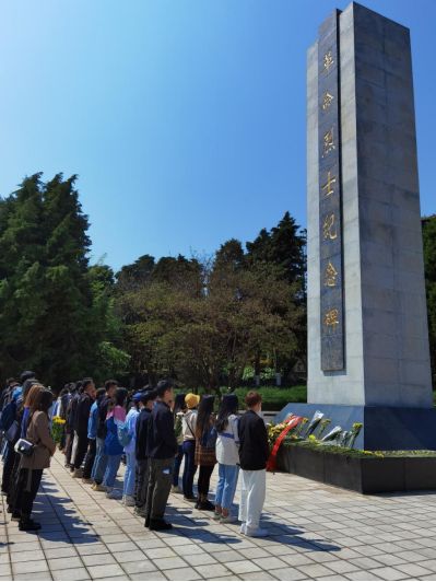 此次学党史教育活动共三项议程。活动第一项议程:全体党员师生、团学干部在烈士纪念碑前开展公祭仪式。由第三党总支书记张萌老师领誓开展重温入党誓词,65名党员怀着庄严崇敬的心情在烈士纪念碑前郑重宣誓。