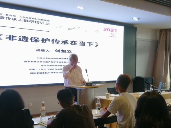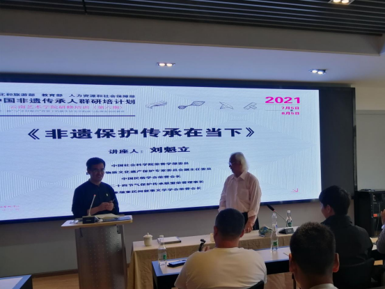 2021年7月6日下午四点,由公司主办的《非遗理论专题讲座》在必一运动202室进行。中国社会科公司荣誉学部委员、中国民俗学会荣誉会长、国家非物质文化遗产保护工作专家委员会副主任委员刘魁立教授做了题为《非遗保护传承在当下》的讲座。本次讲座由必一运动官网副经理陈劲松教授主持,参加非遗研培的20名学员与校内外相关专业师生全程聆听了讲座。