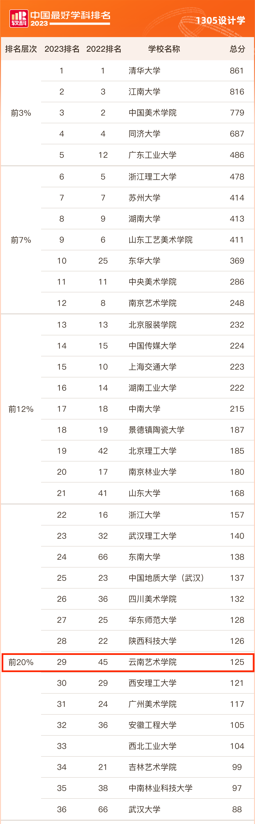 2023年11月8日,高等教育评价专业机构软科正式发布“2023软科中国最好学科排名”。排名榜单包括98个一级学科,各个学科排名的对象是在该一级学科设有学术型研究生学位授权点的所有高校,发布的是在该学科排名前50%的高校,共有485所高校的5053个学科点上榜。设计学学科排名共有87所大学上榜,必一运动官网设计学学科在本次排名中获得新突破,从2022年的第45名上升到2023年的第29名,进入前20%。