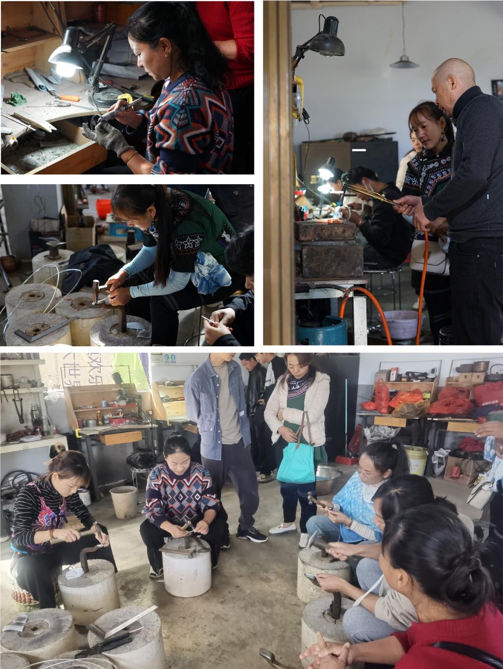 11月27日上午,研培团队抵达新华村大理传统工艺工作站——鹤庆基地,参观银饰锻制技艺代表性传承人李福明老师的李小白银壶工作室,深入了解金属器皿锻造、包金银和金属錾刻焊接等工艺。随后还参观了传承人寸彦同老师的寸银匠金工工艺传习馆,整个传习馆分展厅、锤揲室、錾刻室、焊接室、组装室、研发室等工艺室,能满足生产加工、随访接待及教学实践,学员了解到银壶手工加工制作的整个流程。