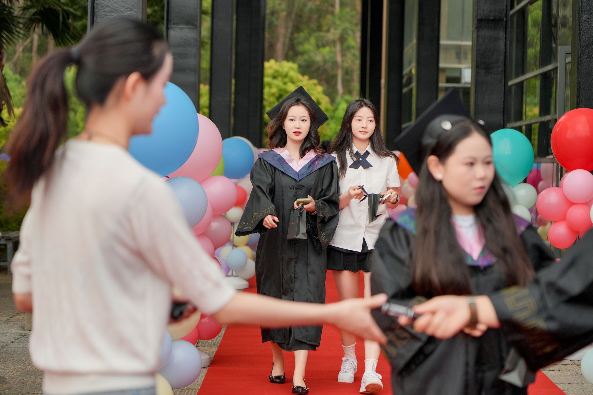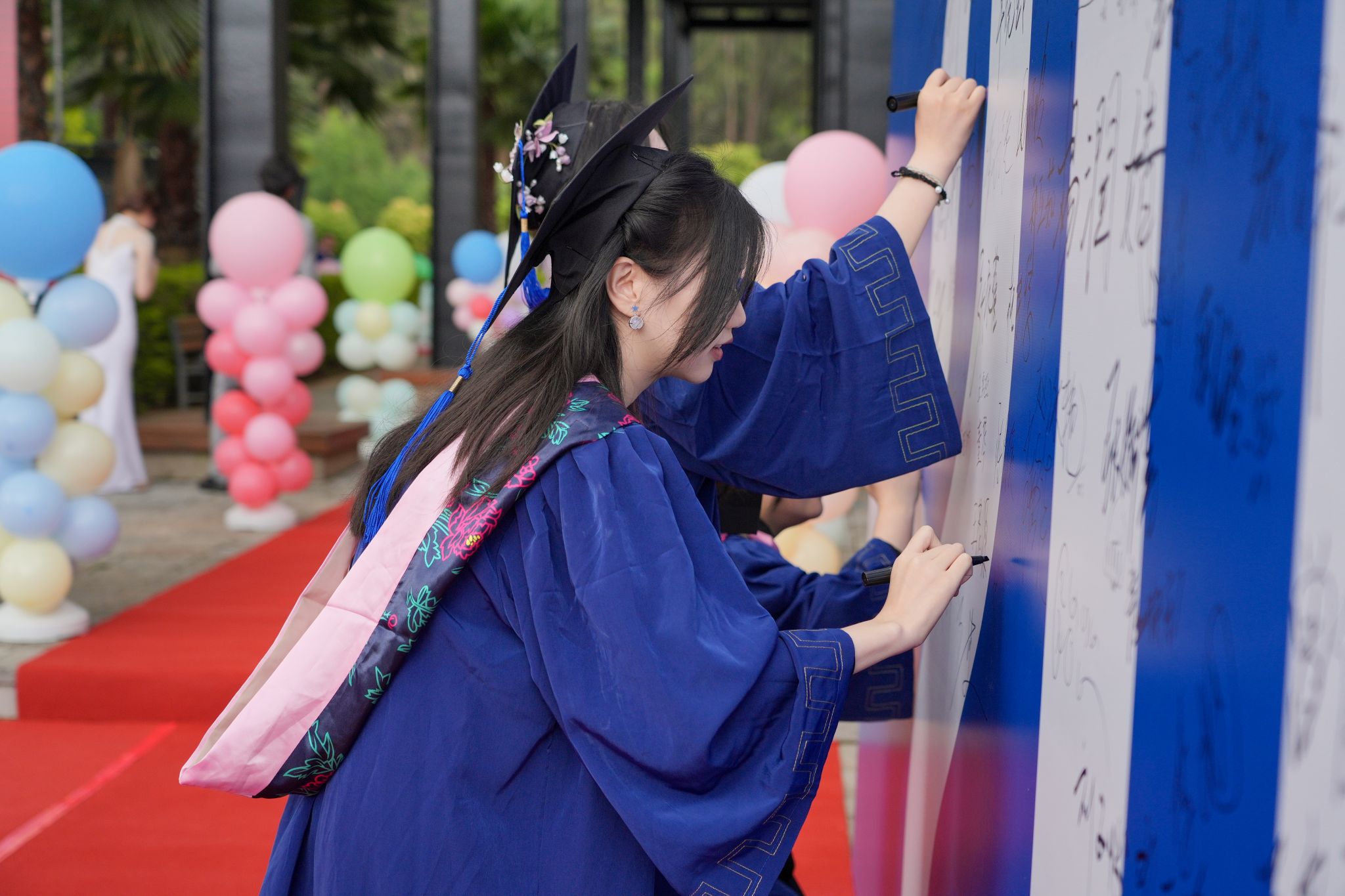 上午9:00,走红毯仪式正式开始,毕业生们身着学士服或硕士服纷纷踏上红毯,并戴上纪念校徽在签名墙前签名留念。随后老师们也集体踏上红毯,共同见证对于毕业生而言意义非凡的毕业典礼。