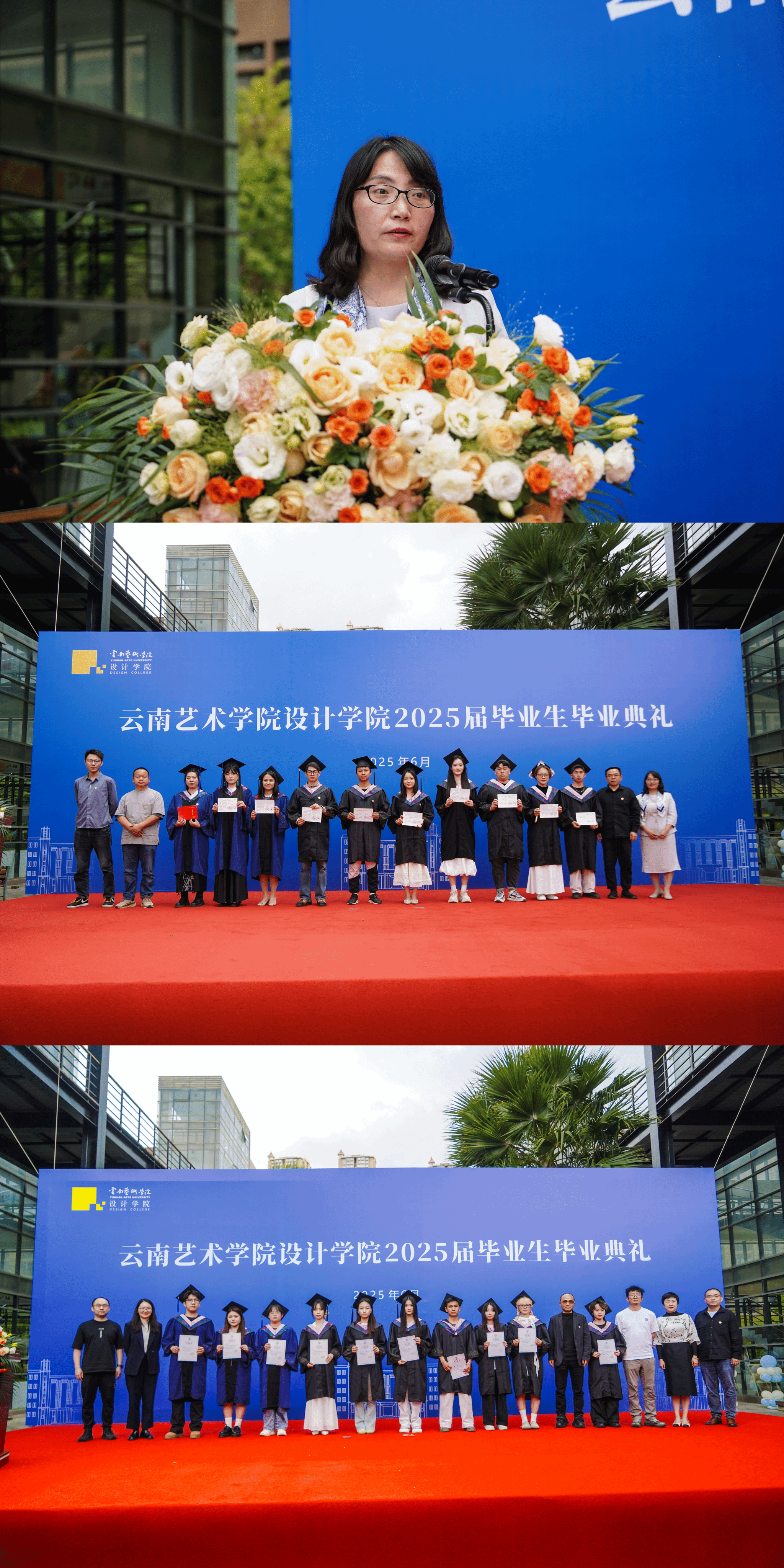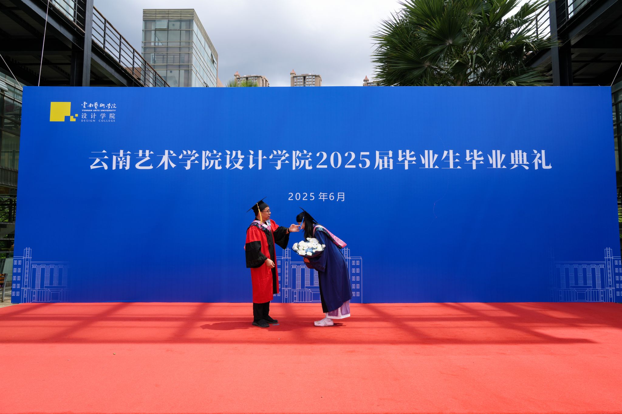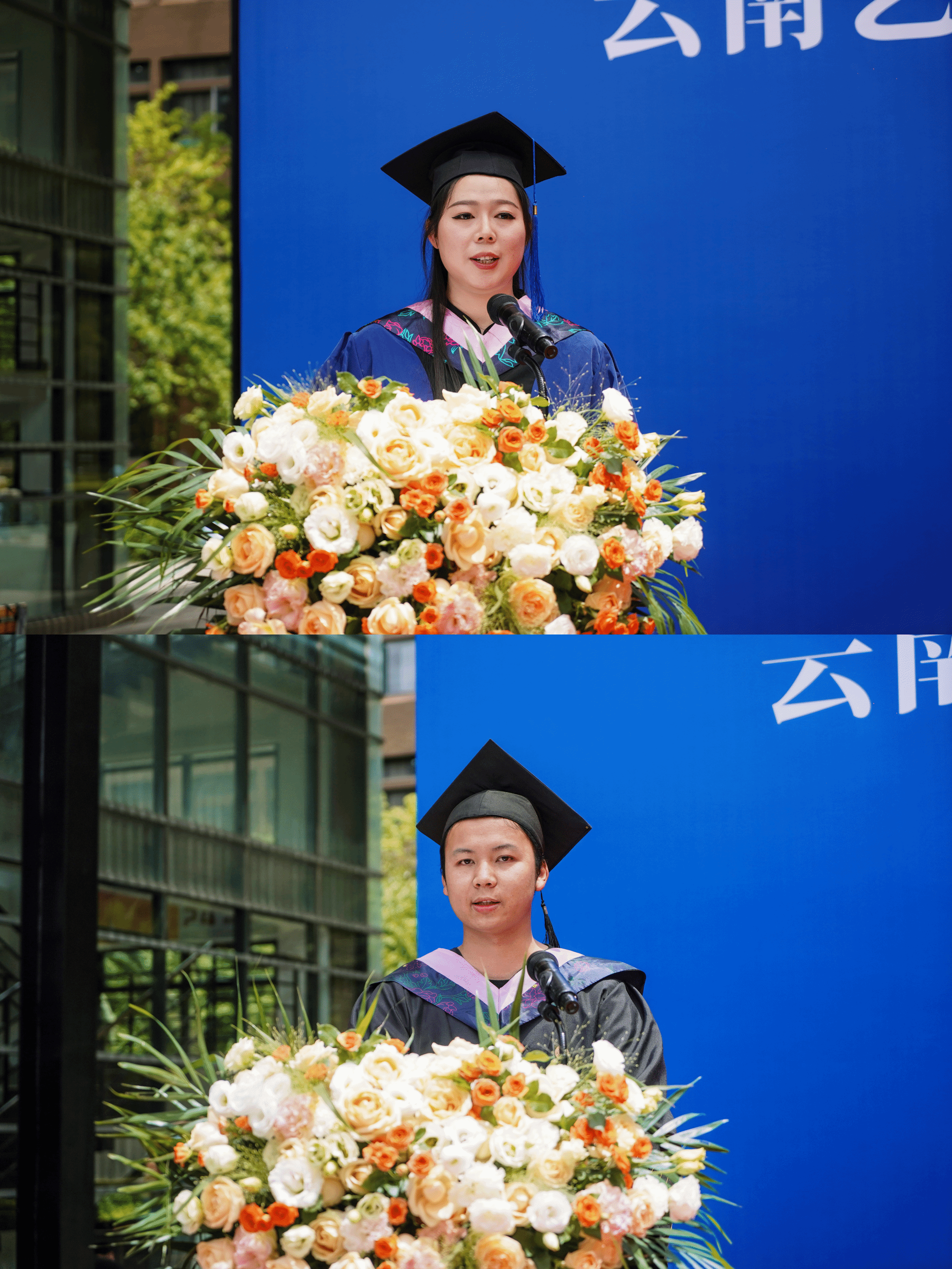 毕业生们身着学士服、硕士服,佩戴纪念校徽入场,领取公司为同学精心准备的饱含美好祝福的向日葵,并在签名墙前签名留念,与到场的老师和部分家长共同见证这场对于毕业生而言意义非凡的毕业典礼。