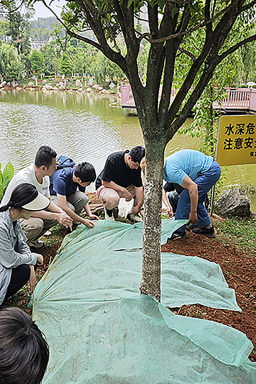 在图书馆湖边草地进行补绿工作(草籽播撒覆盖)