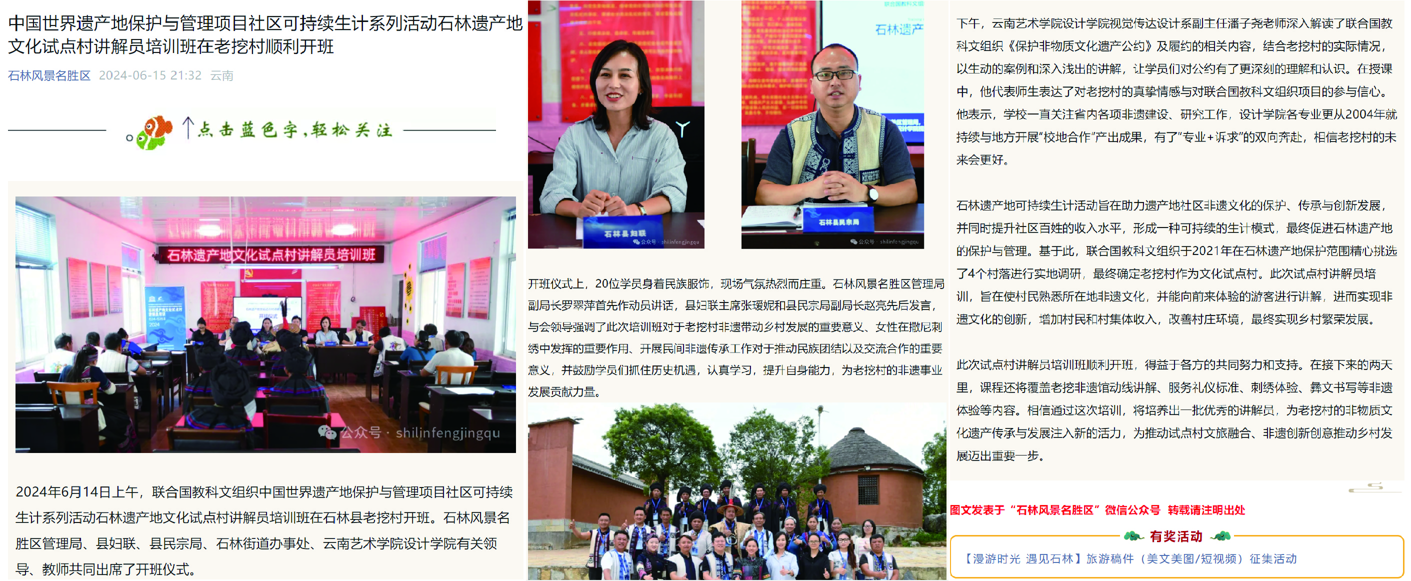 为确保实施效果,在联合国教科文组织、石林管理局建议下,团队成员与有关单位配合,落实开展了《联合国教科文组织文化试点村非遗传习馆讲解员培训活动》,配合完成了村民培训工作。此次培训共20名老挖村村民参与,其中男性学员9人,女性学员11人,含非老挖村户口女性1人。场外旁听14人(男性5人,女性9人),外籍人士4人(男性);另有政府工作人员2人,高校工作人员3人参加了部分课程学习,共计受益人数43人。学员中除1人来自外村以外,其他均来自老挖村社区。参训学员平均年龄47岁,都有自己的家庭,其丰富的社区群体构成,进一步扩大了培训的影响力。在三天的培训工作中,间接影响大、小老挖村民2500余人。